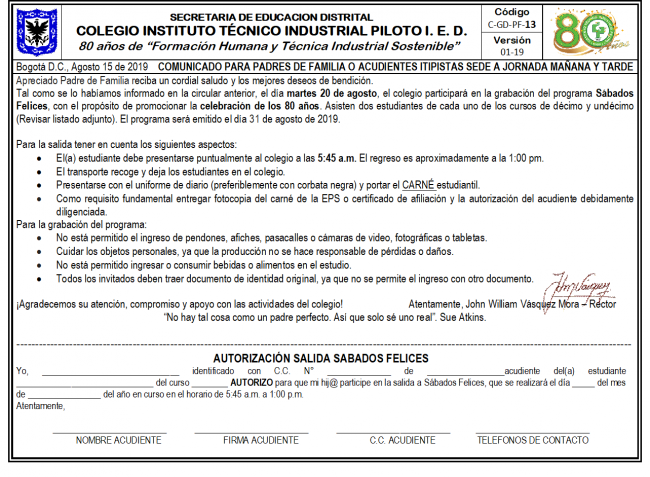 Tal como se lo habíamos informado en la circular anterior, el día martes 20 de agosto, el colegio participará en la grabación del programa Sábados Felices, con el propósito de promocionar la celebración de los 80 años. Asisten dos estudiantes de cada uno de los cursos de décimo y undécimo. El programa será emitido el día 31 de agosto de 2019.