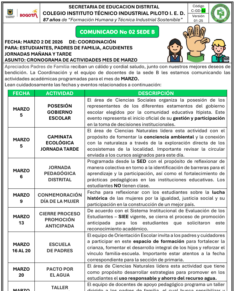 Apreciados Padres de Familia reciban un cálido y cordial saludo, junto con nuestros mejores deseos de bendición. La Coordinación y el equipo de docentes de la sede B les estamos comunicando las actividades académicas programadas para el mes de MARZO.