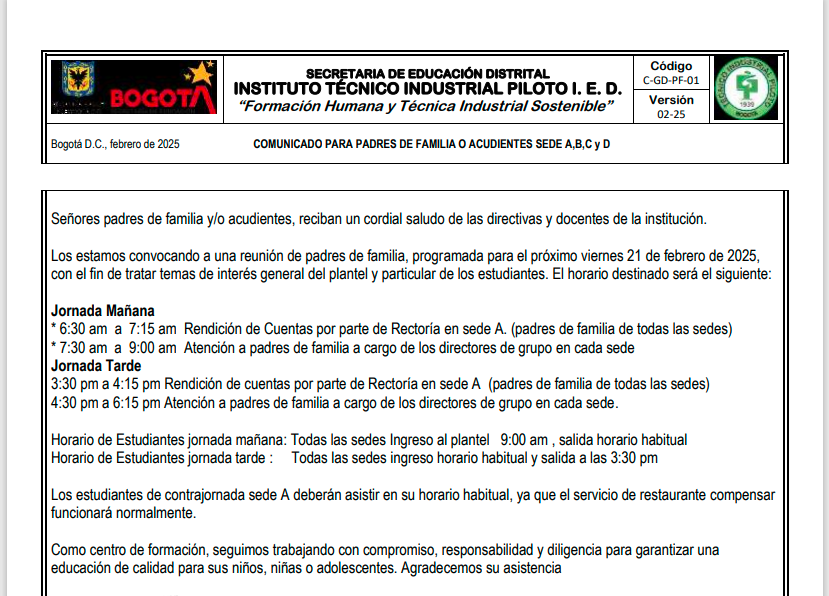 COMUNICADO PARA PADRES DE FAMILIA O ACUDIENTES SEDE A,B,C y D