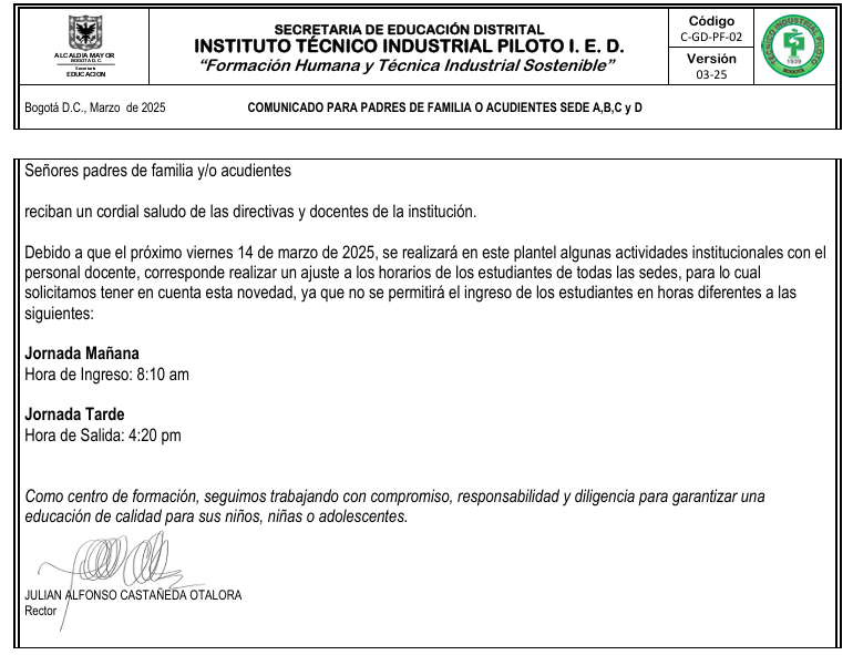 Debido a que el próximo viernes 14 de marzo de 2025, se realizará en este plantel algunas actividades institucionales con el personal docente, corresponde realizar un ajuste a los horarios de los estudiantes de todas las sedes, para lo cual solicitamos tener en cuenta esta novedad, ya que no se permitirá el ingreso de los estudiantes en horas diferentes a las siguientes: