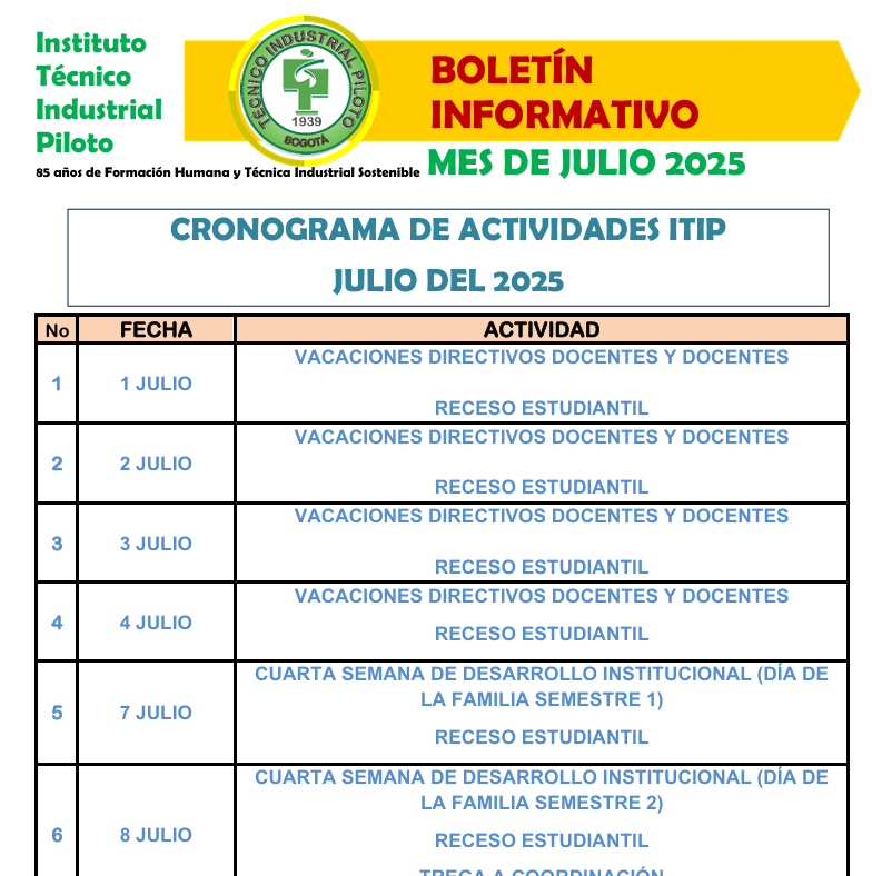 CRONOGRAMA DE ACTIVIDADES ITIP JULIO DEL 2025